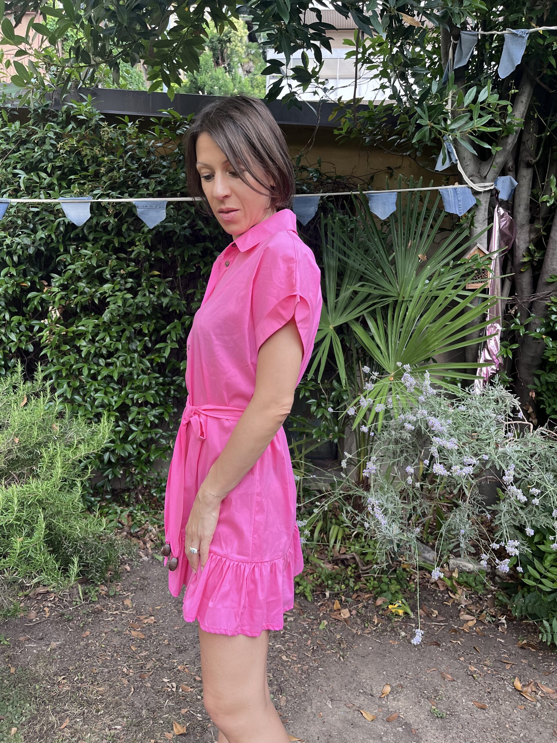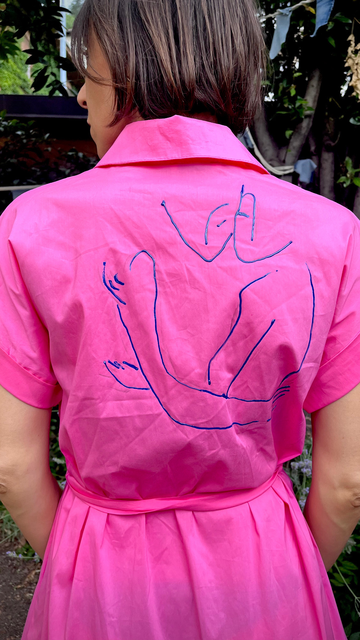 Abito second hand in cotone colore fucsia che mostra una coppia di amanti che si baciano dipinta a mano, modello morbido pulito per ricordare la carta dei Tarocchi ispirata agli amanti, la scelta