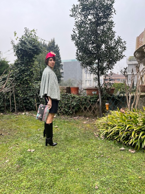 Cerchietto realizzato artigianale applicando una foglia di velluto fuxia sulla quale spunta tra i petali di un fiore vintage una civetta colore fuxia.