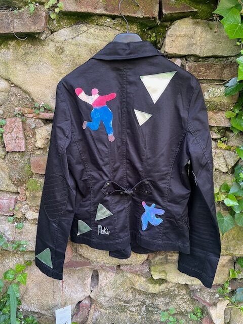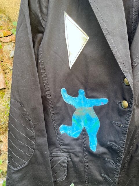 Ho così trasformato una giacca second hand colore nero cucendo qua e la nana dipinte a mano e triangoli in pelle argento in ricordo delle opere di Niki de Saint Phalle