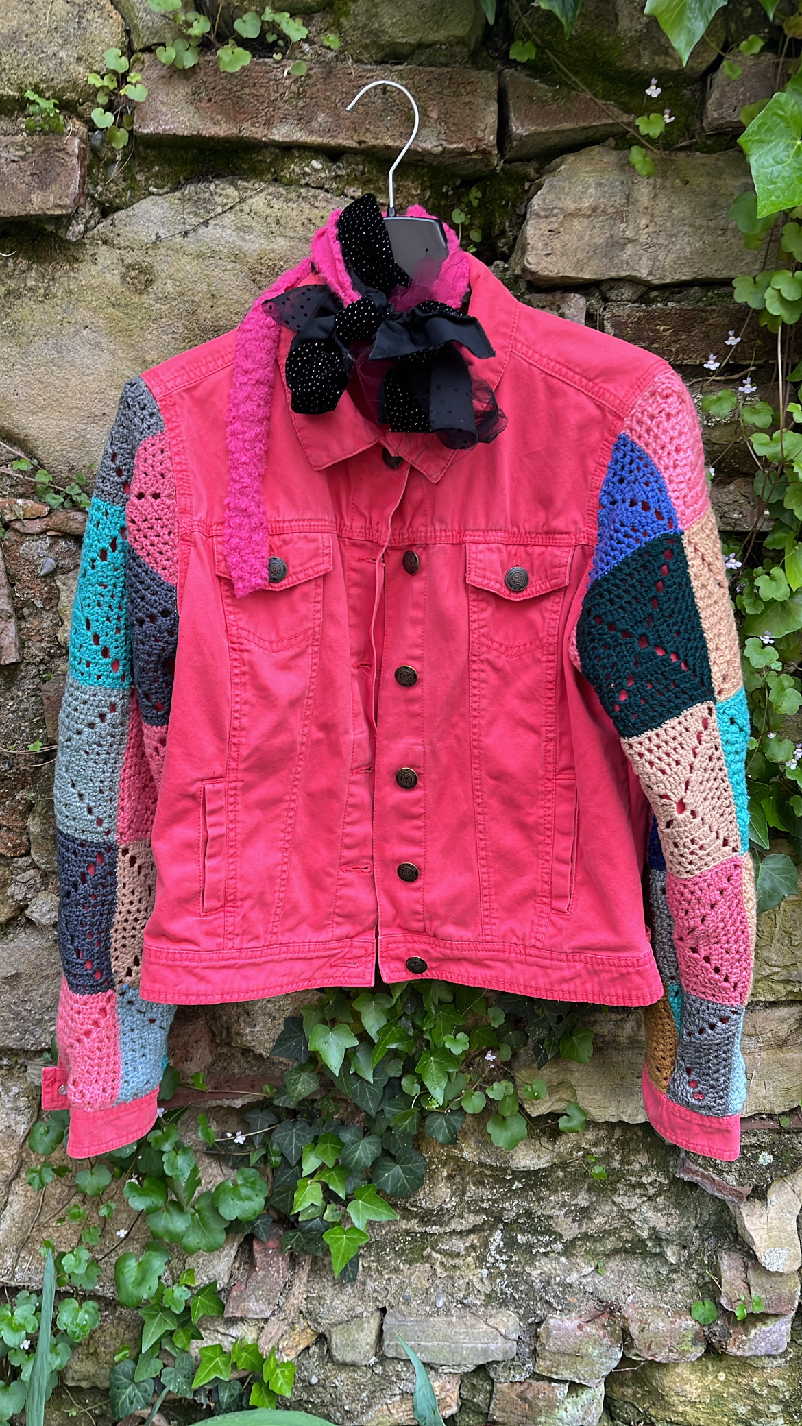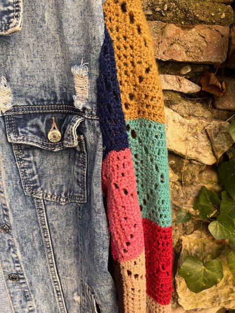 Ho così trasformato una gilet di jeans second hand cucendo sulle maniche mattonelle realizzate crochet multicolore