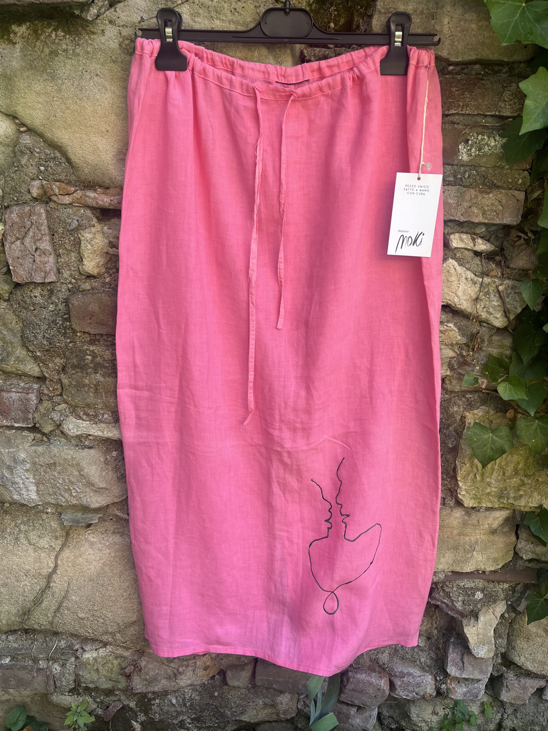 Gonna vintage in lino colore fucsia che mostra una coppia di amanti che si baciano dipinta a mano, modello morbido pulito con coulisse in vita per ricordare la carta dei Tarocchi ispirata agli amanti, la scelta