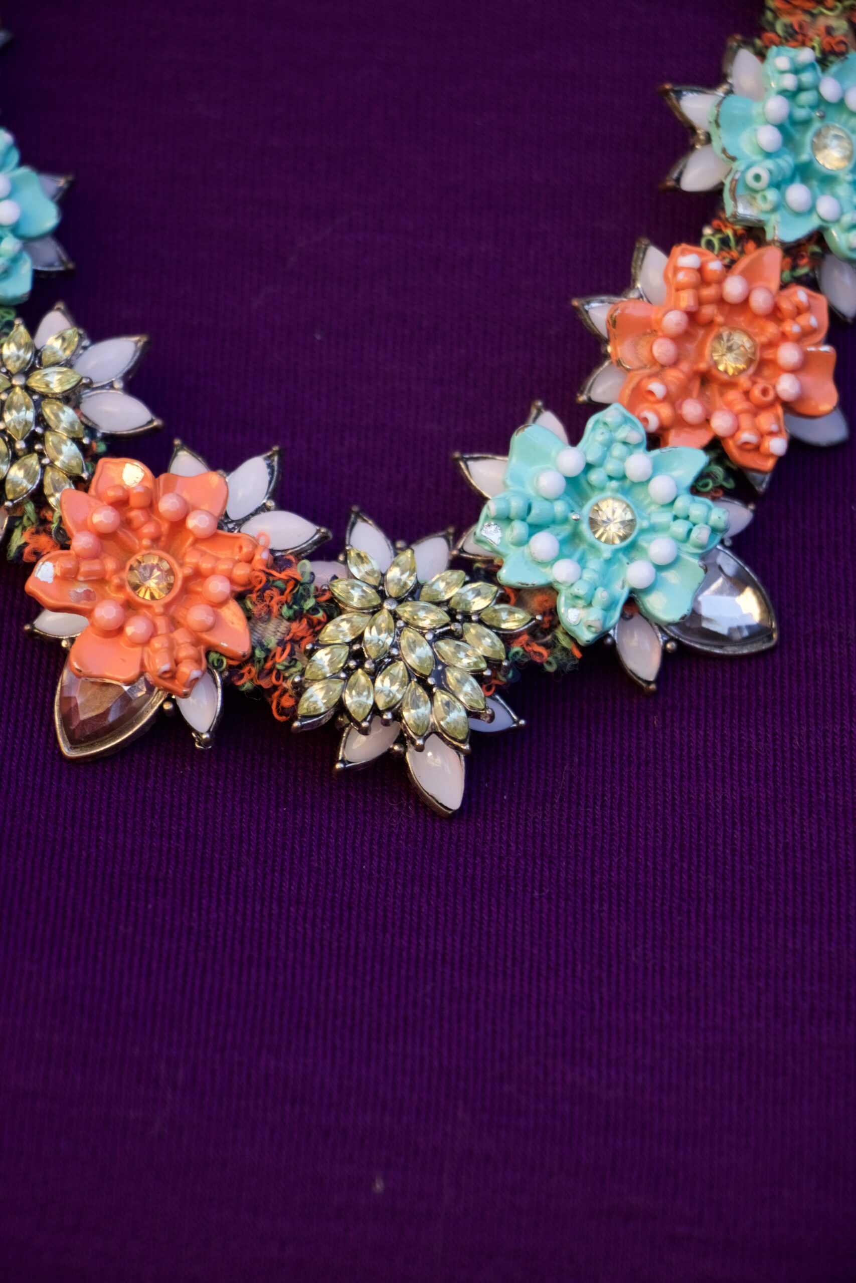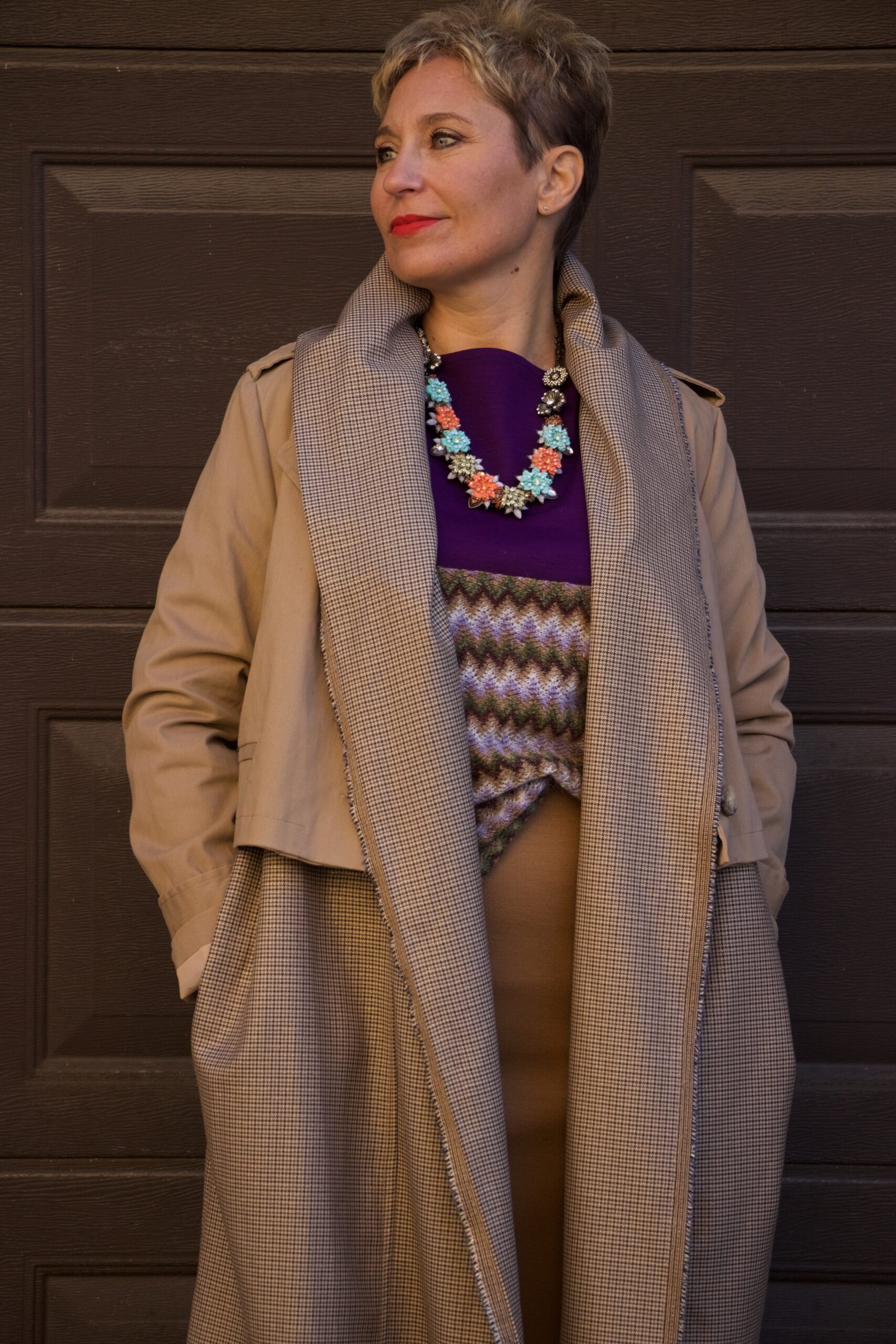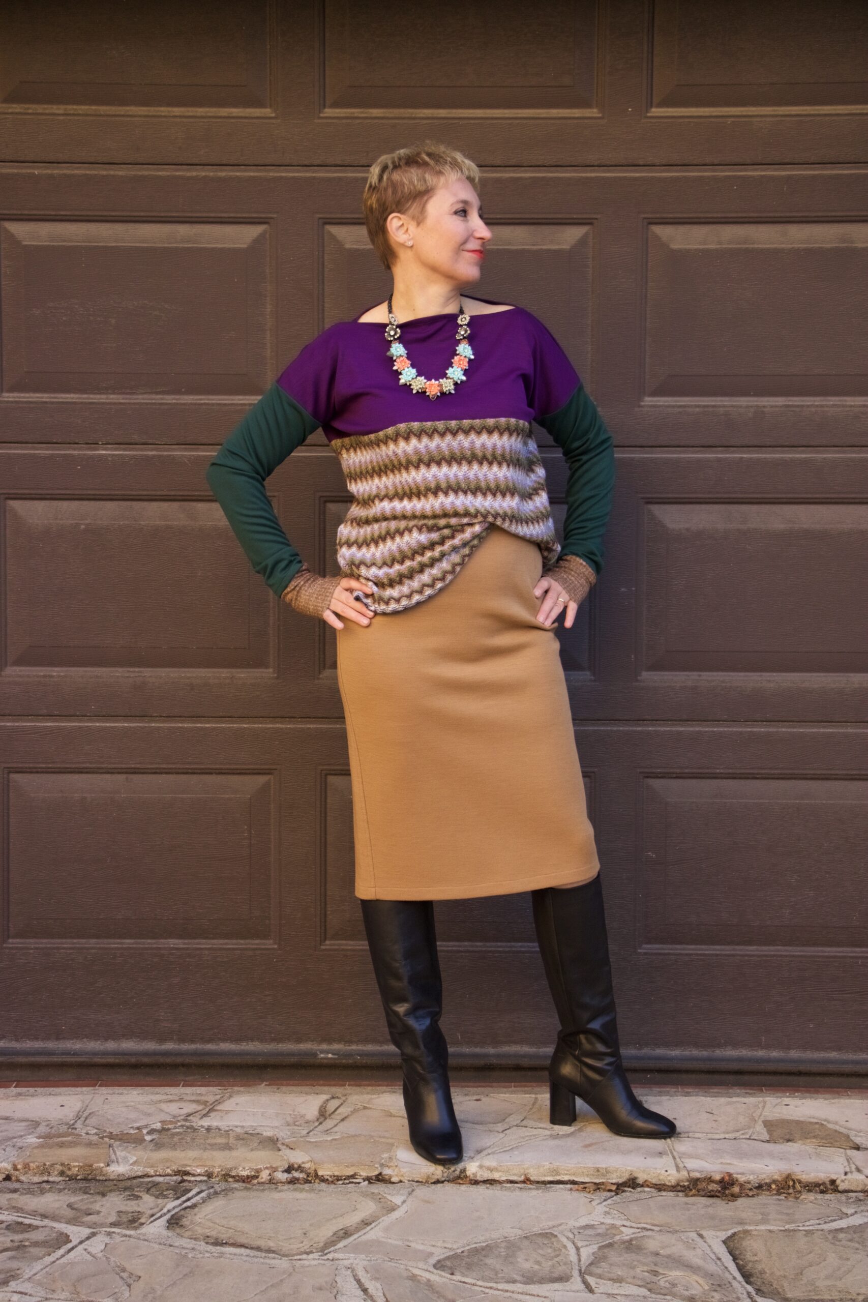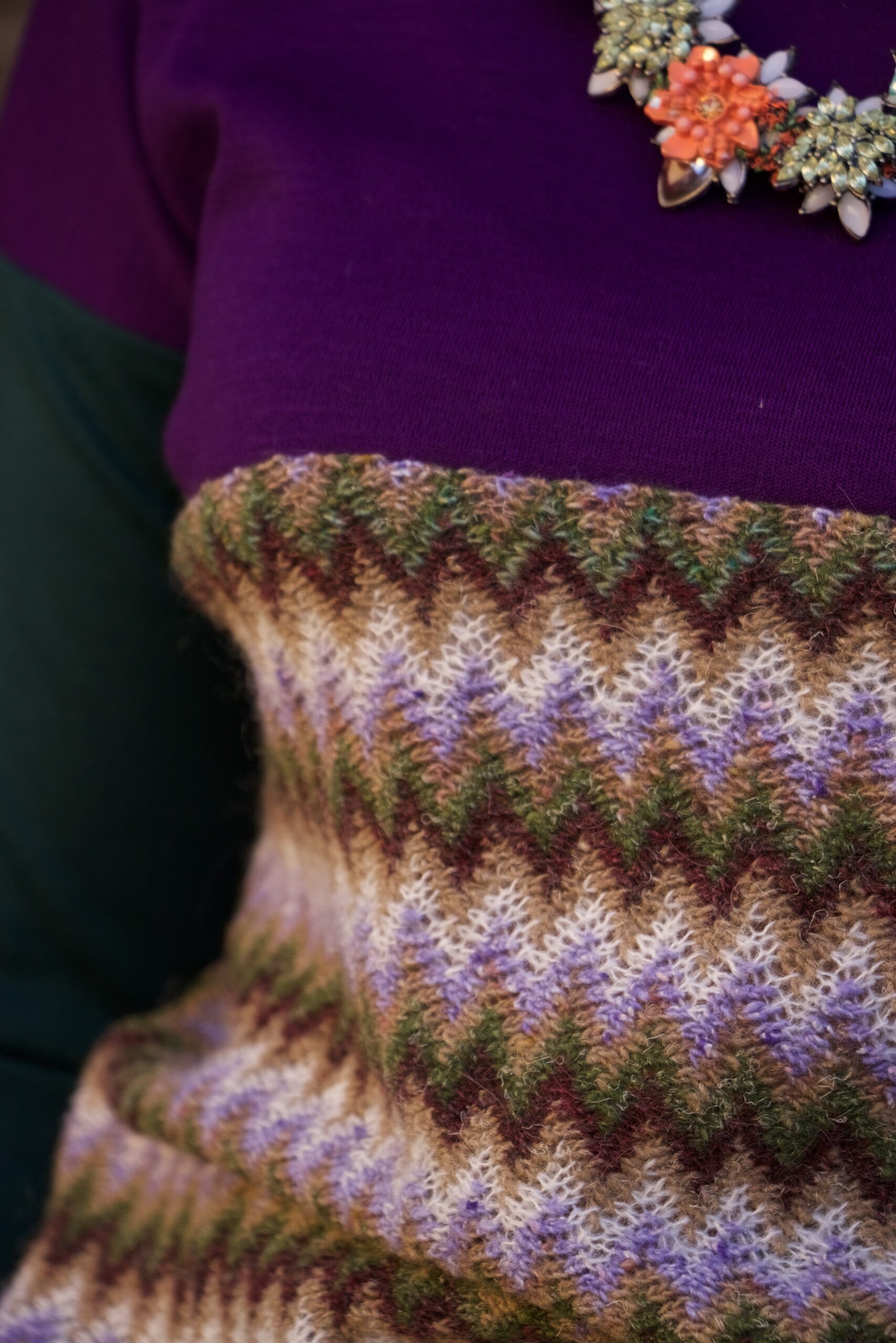 Maglia realizzata sartoriale in lana colore viola e verde e pizzo multicolore, modello pulito con colletto rettangolare