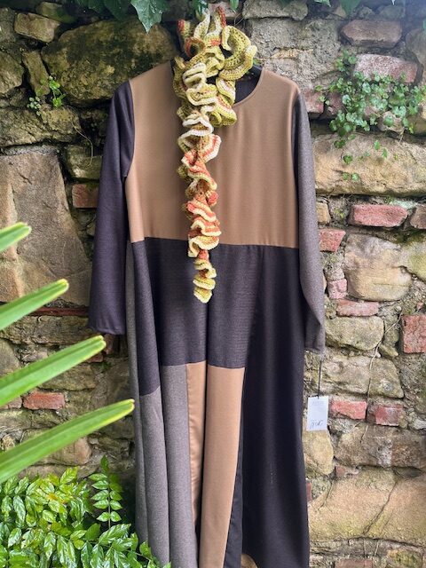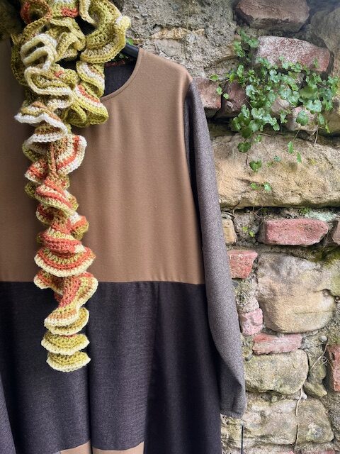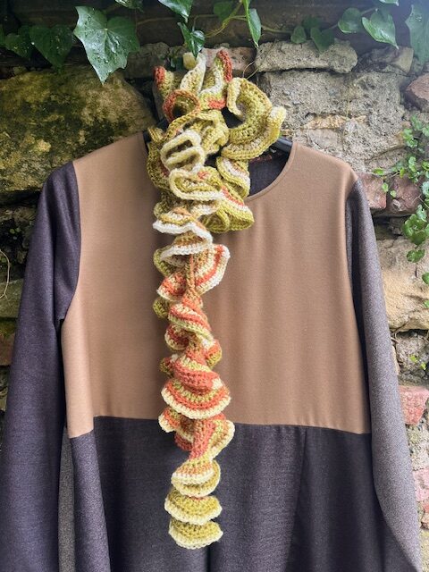 Sciarpa realizzata knitting in lana multicolore con un filo di lamè dorato, modello effetto riccioli